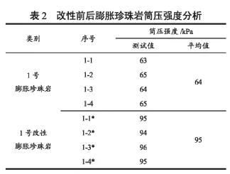 以改性前后的1號膨脹珍珠巖為主要原料制備兩組膨脹珍珠巖保溫板,從而研究膨脹珍珠巖筒壓強(qiáng)度的差異對保溫板性能造成的影響,兩組膨脹珍珠巖保溫板性能,見表3。